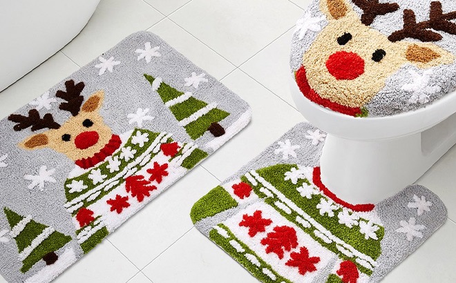 Gray & Red Holiday Reindeer Bathroom Rug Set