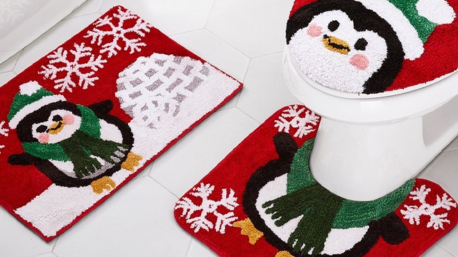 Red & White Holiday Penguin Bathroom Rug Set