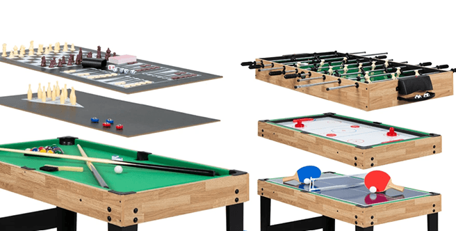 It has an interchangeable top that lets you play foosball, billiards, slide hockey, table tennis, bowling, cards, chess, checkers, backgammon and shuffleboard. One the game is over, you can stack all surfaces between the billiard base and foosball table, for convenient storage. Check it out here!