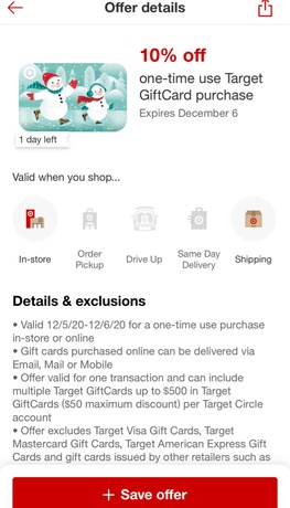 Get 10% off when you purchase a GC at Target. Can be used in one transaction up to $500 and they could be multiple ones.