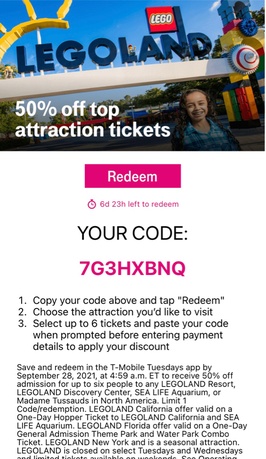T-mobile Tuesday deal and feel free to use my code since I’m not going to use it. Perfect for someone planning on having family trip.