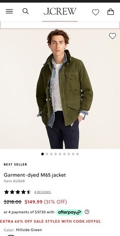 J. Crew [jcrew.com] has Men’s Garment-dyed M65 Jacket for $51 when you apply JOYFUL & SMPH64GUA. Shipping is Free with a Rewards account; free to join.