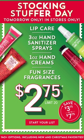Lip care, 3oz hand sanitizer sprays, 1oz hand creams, and fun size fragrances will be $2.75. There is a limit of 20.