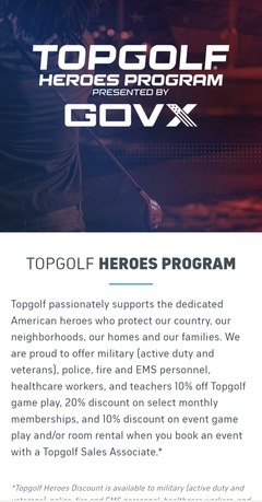 TopGolf is offering discounts for teachers, military, Healthcare workers, police, fire, and EMS personnel! Check out their website to see if you’re eligible.
